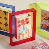 中身をクリア板で挟んで固定でき、四隅の留め具が見せ方をすっきりまとめます。カラーが入ったフレームは光を受けて表情が変わり、無地の空間でも“展示感”をつくりやすくなります。卓上に置いて目線を集める使い方はもちろん、複数点を並べたシリーズ展示にも向いています。