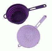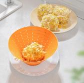 折りたたみ式のシリコン水切りザルです。使用時はボウル形状でしっかり水を切れ、使わない時は薄くたためるため、キッチンの引き出しや棚でも省スペースで保管できます。野菜を包むように曲げて洗える柔軟さがあり、サラダづくりや下ごしらえの手間を軽くします。ハンドル付きタイプのように見える形状もあり、用途に合わせた仕様提案もしやすい点が特長です。