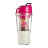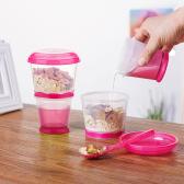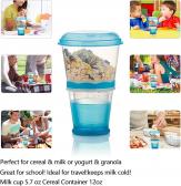 ミルクとシリアル(グラノーラ)を別々に入れられる二層構造のタンブラーです。食べるタイミングでミルクを注げるため、シリアルがふやけにくく、忙しい朝でも手軽に用意できます。フタ付きで持ち運びやすく、付属スプーンでそのまま食べられる設計です。容量の目安は、ミルク容器が約5.7oz、シリアル容器が約12ozです。