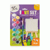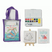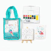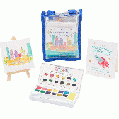 小さなキャンバスとイーゼル、水彩パレット、ブラシ、専用ペーパーをセットにした「ミニ水彩画キット」です。子ども向けワークショップから企業イベントの体験ブース、アート教室の入会特典まで、幅広い場面で活用できる本格的なミニアートセットです。