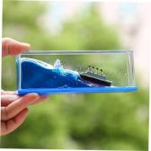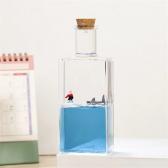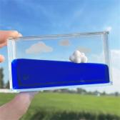 透明なケースの中で青い液体がゆらゆらと波打ち、その上を 小さなモチーフが漂う幻想的なデスクトップオブジェです。