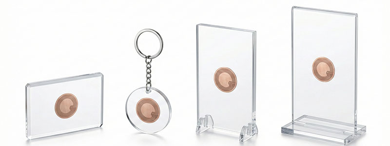 NFCを内蔵したアクリルグッズにスマートフォンをかざすだけで、動画・音声・キャンペーンなどのデジタルコンテンツを体験できる新しいノベルティです。